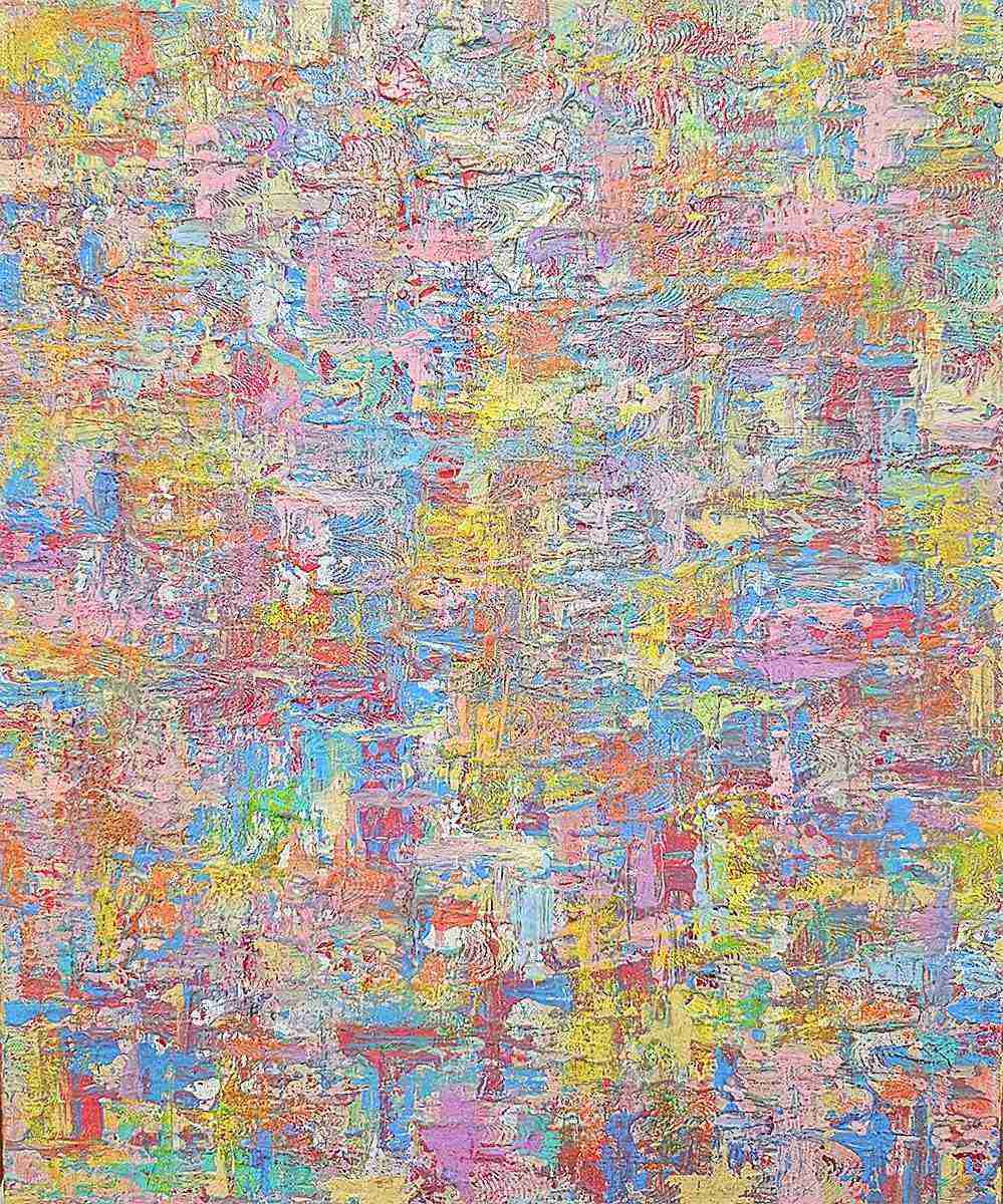 The textured strokes and vibrant pastel hues represent the emotions that often overlap and blend within us—joy, nostalgia, serenity, and happiness. Each layer reflects a moment, a story, or a fragment of thought, blending into a tapestry of color and texture. The dynamic harmony of the composition invites viewers to find their own reflections within the interplay of shapes and colors.