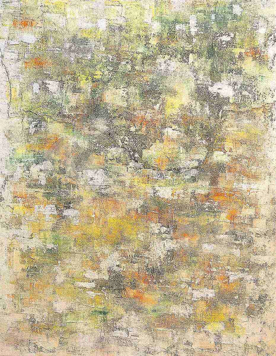 This abstract composition draws inspiration from the delicate interplay between earth and atmosphere, capturing the essence of weathered landscapes viewed from above. The painting employs a harmonious palette of muted yellows, gentle greens, and warm oranges, interwoven with whites and earthy neutrals that create a sense of organic decay and renewal.